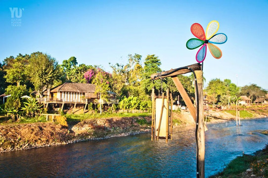 我住在沿河的客栈里,那里虽然不是什么高级酒店,却是我心中的拜县应有的样子,鲜花和树篱环绕着泰北的吊脚楼,木墙壁和草篷顶的屋子踩上去咚咚作响。白天里客栈一个住客都不见,烈日驱离了他们,景点将他们“拐走”。到了晚上,灯火照亮拜河,彻夜不停的觥筹交错和歌声让这里成为了一个小芭提雅。