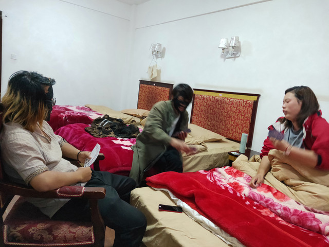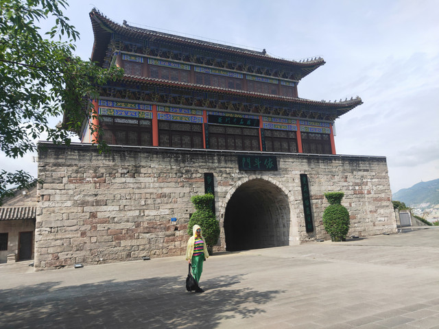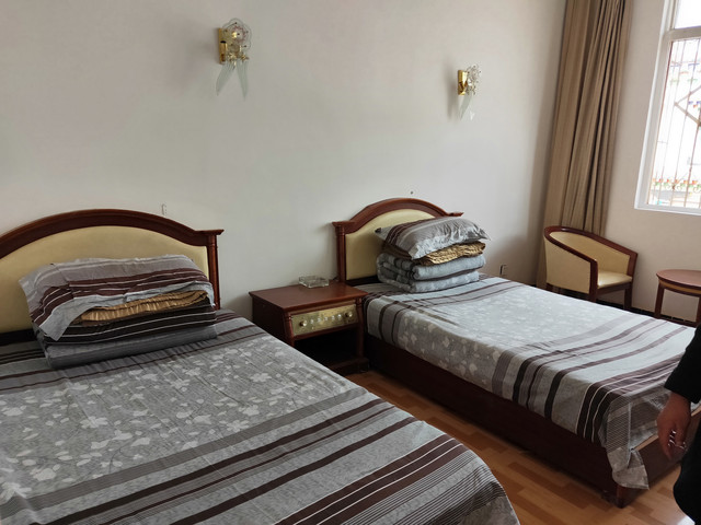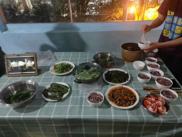 城里的景点比较集中,我们走路就能到,还顺便买了水果。今天的住宿包晚饭,比中午的拼饭值多了。而且菜品太好吃了,特意去感谢了厨师。(骑友也说是一路上吃得最好的一次)我吃了两碗半米饭,这会就不吃素啦!然后约喝茶,发现了别人屋的条桌,就请示搬了来。同屋去洗了水果,仪式感更强了