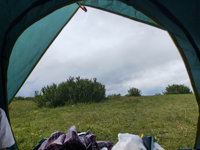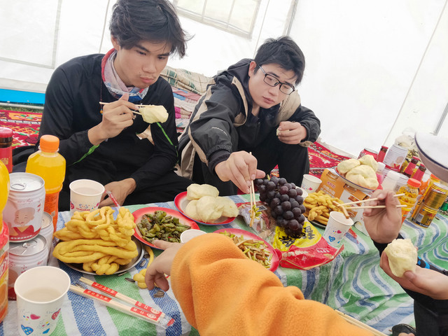 中午在帐篷中休息时穿短袖都热,一会变天只能穿上羽绒服,有个衣着单薄的美女,还到我们的帐篷口躲风,几番邀请才肯入内。又馋串串了