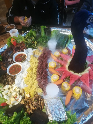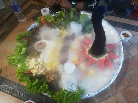 上菜,恩!颇为惊艳哈,大圆簸箕底盘,覆锡纸, 有香茅草烤鱼、傣味柠檬鸡、傣味酸笋牛肉、烤五花肉、包烧金针菇、三色手抓饭等一些粗粮果蔬,再配上点干冰,云雾缭绕,高大上的感觉有木有?服务员给我们每人一片叶子和一次性手套,告诉我们这就是我们的“碗”,把食物相互搭配捏在一起吃……
