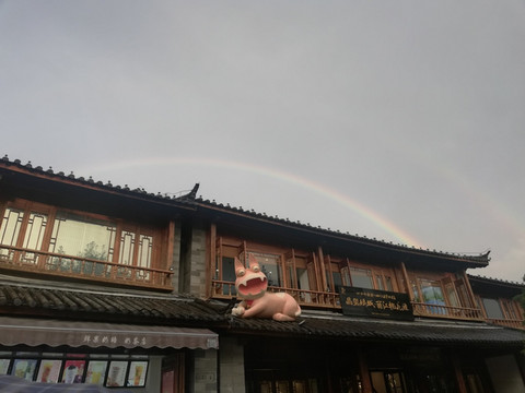 傍晚时分,一行人走出古城,雨后的空气,潮湿略带寒凉,抬头间,见双彩虹丽景,掏手机拍了下来。