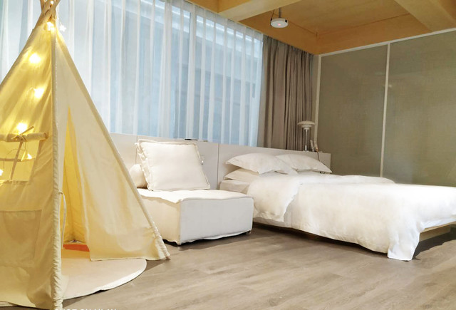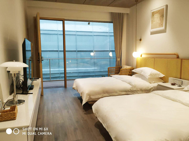 之前和朋友在这里住过一次,给我的感觉很好,跟在家一样,让我觉得很温馨,所以这次短暂的旅途,让我再一次选择在了这里,民宿位于岸上服务区的网红街,可以算是网红民宿,办理入住手续特别快,而且前台小姐姐都特别好,很有礼貌,这次我们入住的是一间双床房和一间豪华大床房,听前台的小姐姐说民宿还有日式房和滑梯 被亲子房,但是十一出行人多,没有订到喜欢的房型,被子是柔和的触感,坐在床上更是舒适柔软,纯白的床品加上暖暖的灯光,竟然看出了那么一丝温柔感,拉开金色是窗帘,阳光溢满了整个房间,构筑起温暖的情绪。