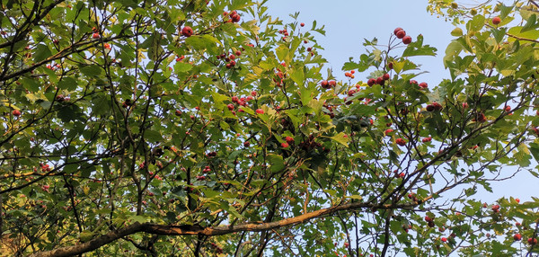 沿路见有许多山楂树,树上挂满了山楂果。