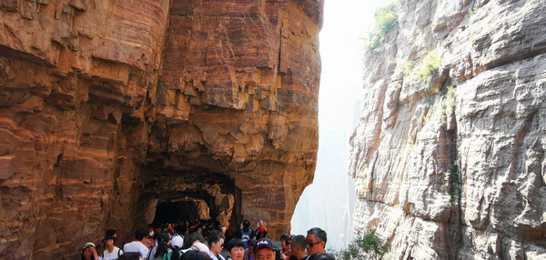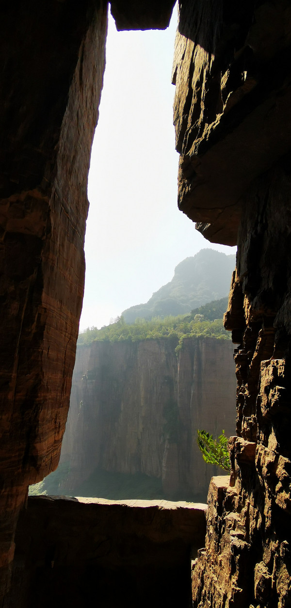 每隔一段距离,便有一个通风口,也叫天窗,共有35个。洞外便是300米深、500米宽、6000米长的红岩绝壁大峡谷。