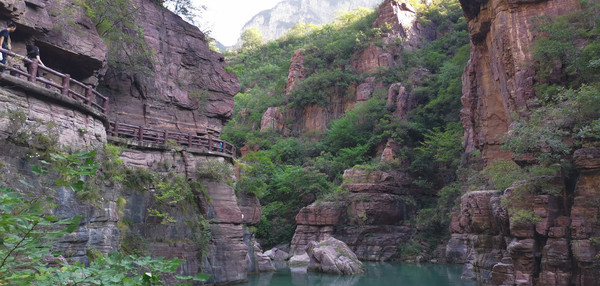 石红水绿,栈道缠绕在山腰。
