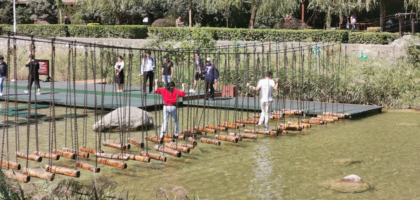 一条溪谷,增添了很多游乐设施。也有人失足落水,引来一阵哄笑。