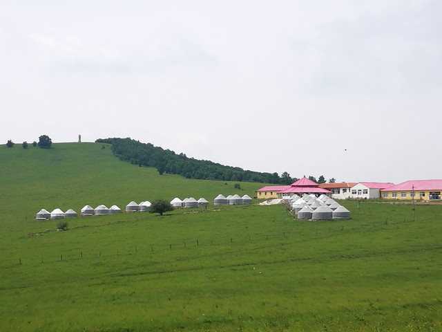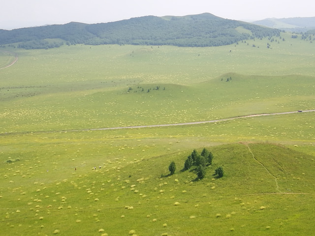 我们先去了影视城景点,这个景点人最多,其实就是好多电影拍摄取景的地方,比较著名的有《还珠格格》、《康熙王朝》、《射雕英雄传》等,原来拍电影用的蒙古包还在,已经很破旧了。附近修的有登山栈道,当徒步登上山顶,环顾四周,草原的辽阔壮美尽收眼底,像一张巨大的绿色地毯,群山起伏,其中还点缀着一颗颗、一片片白桦树和一种泛黄的圆墩形巨草,展现出一种辽阔、秀丽的景色,手机摄影已无法表达出她的魅力。