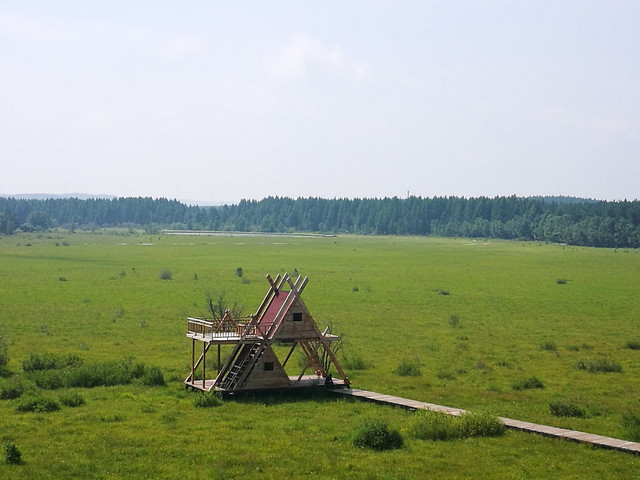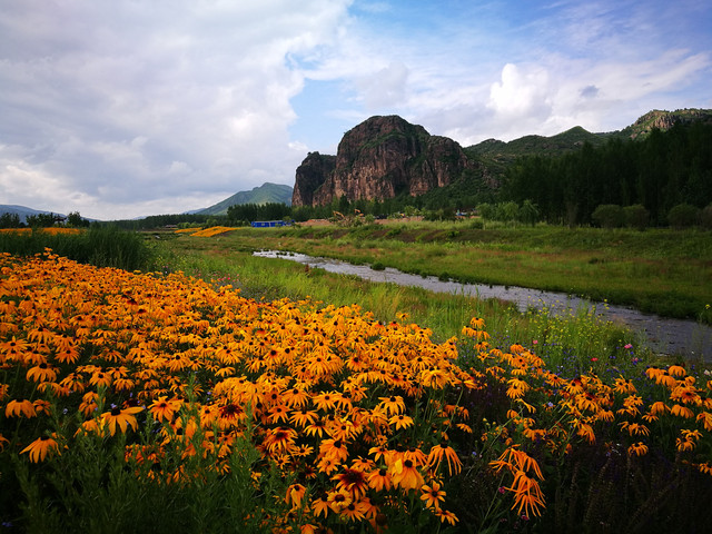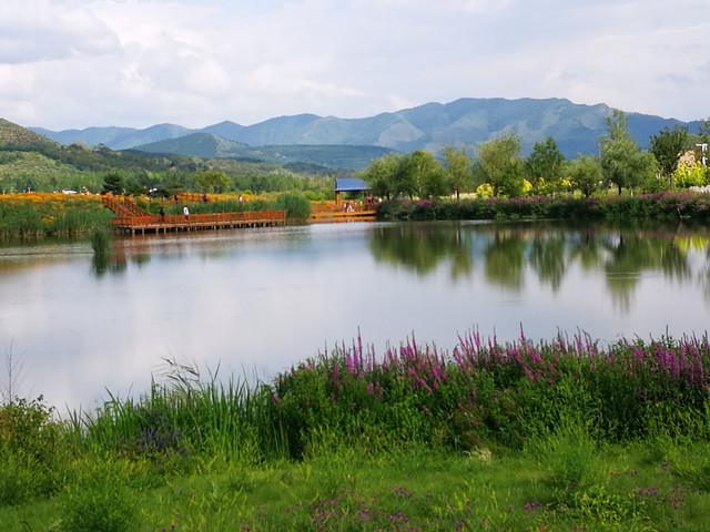 中午吃过饭后从承德出发沿承围高速、四御线到塞罕坝,途中参观一湿地公园,虽属于人工种植的花,但和山水搭配观赏性还是不错的,可能是正在建设阶段,没有门票。