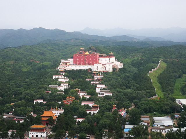 上午到避暑上庄参观,门票130元、景区车50元,这是一个清朝时的皇家园林,最初建山庄的目的是为了军事,清朝皇帝每年会召集文武官员到此打猎,实际就是一种军事演习,因皇帝要临时办公,所以需要建设行宫。在避暑山庄周围其实有12座寺庙,其中三座不设喇嘛,由内务府派绿营兵把守。其余九座由雍和宫管理,在北京设八个办事处分别管理各寺庙事务,史载均称外八庙,泛指避暑山庄外驻有喇嘛的寺院。久而久之这十二座寺庙就统称为外八庙了。1994年外八庙和避暑上庄一起被列入世界文化遗产。外八庙中最大的是普陀宗乘之庙,有小布达拉宫之称,是为庆祝乾隆六十大寿和皇太后八十大寿而建,坐景区车可以登高处观赏,下图就是外八庙中的小布达拉宫,雄伟壮观。 坐观光车主要是可以看承德市全貌和远观外八庙的全景,如果只想看避暑山庄就不用买景区车票。如果想进外八庙里面,还要单独购票。