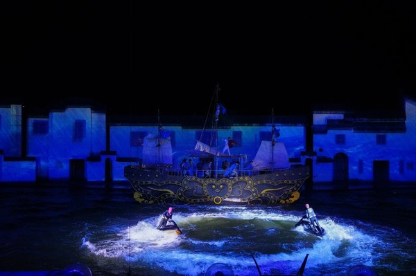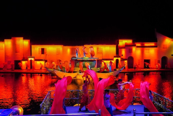这场耗资2.3亿打造的演出舞台场景,能够同时满足1700名游客现场观看。置身其中,观演一体。你也是这场大戏的参与者,180余位演出精英同台演绎,高空绸带、高空跳水、水上摩托等特技搭配3D投影,声光水舞,爆破等特效。为你献上一场高水准演出。带来极为震撼的视觉盛宴!