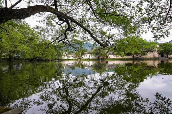 村中湖光山色与层楼叠院和谐共处,自然景观与人文内涵交相辉映。月沼常年碧绿,塘面水平如镜,塘沼四周青石铺展,粉墙黛瓦整齐有序分列四旁,日月星辰跌落水中。以月沼为中心,周边围以住宅和祠堂,内聚性很强。这里还是尊儒崇商的礼邦之地。祠堂学院,重礼兴教,积淀了丰厚的文化底蕴。名仕儒商,数百年繁荣,传承了儒雅诚信的徽商情怀。弥漫在堂前的古旧气息将我的心慢慢沉静。一幅幅砖雕、石雕、木雕浅绘着花鸟虫鱼,人物故事,将不同朝代的文化历史做一次风云聚会。