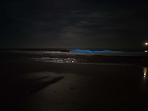 “The waves are created when phytoplankton, called "dinoflagellates," crash in the tide, reacting and causing bioluminescence when jostled. ” (荧光的海浪是由于一种名为鞭毛藻的海藻在潮汐中碰撞而产生的生物发光) -- 10news.com