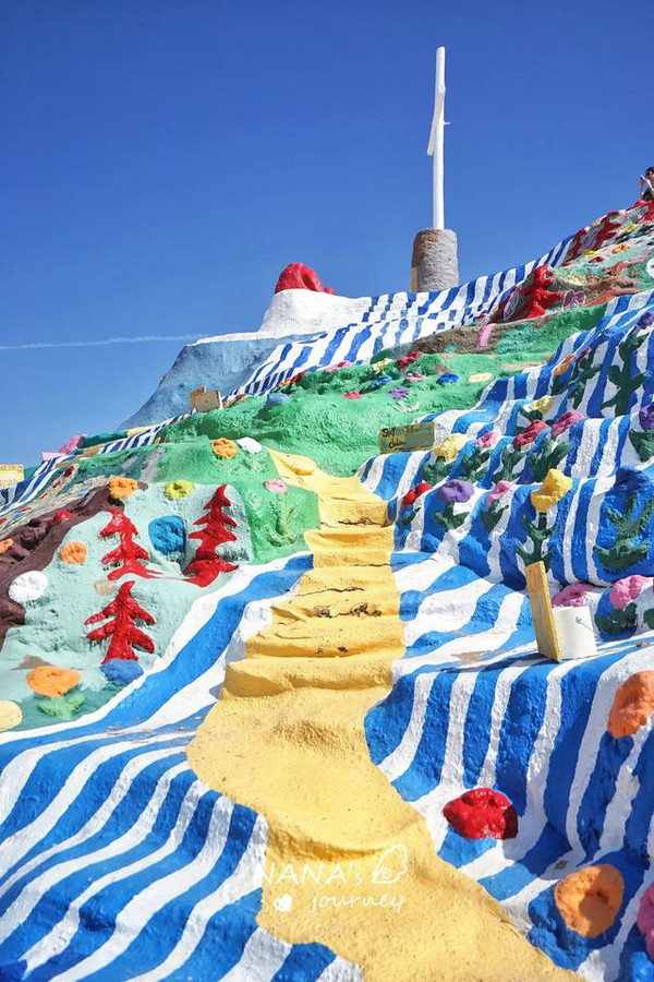 如瀑布般的白蓝条纹和彩色花朵之中,黄色的小路,拾阶而上,略崎岖,但也仿佛走入童话故事的阶梯。