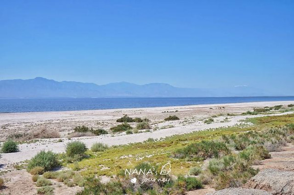 开回棕榈泉的途中,还是忍不住来索尔顿湖打了卡,湖水蓝的像海一样,一侧又是白色沙滩,据我们观察,还是有不少度假酒店建在湖边的。我们并没有进去,停车场都要收费,而我们也没有玩的意图,匆匆打卡拍照就离开了~