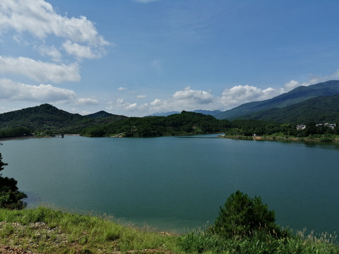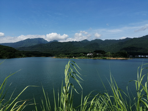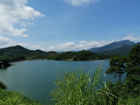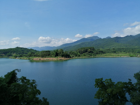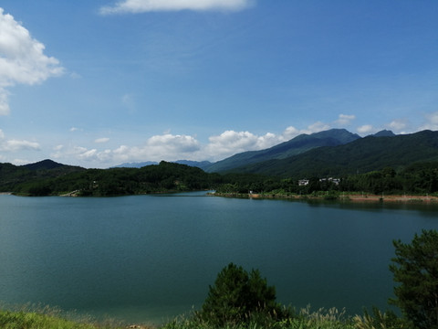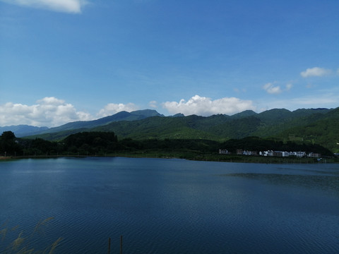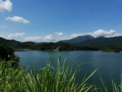 看到周家水库的那一刻,感叹于不虚此行。水库水质清澈明净,周边山脉奇峰耸立、层次分明。躲在山头那边的一片片云朵,把大片的蓝天让道给水库的天空;而水库的天空却把水库影照得像一幅蓝色的画卷。微风轻轻吹过,水面掀起了片片涟漪。