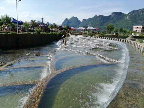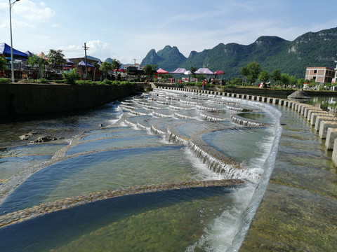 杨村的旅游亮点在于鱼鳞坝。鱼鳞坝远视像是一条披着厚厚鱼鳞的大鱼,近看却是阶梯式的一个个分隔的小水池,在碧水蓝天以及远处青山的衬托下充满了奇幻色彩,让人忍不住要去欣赏它,要去亲近它!