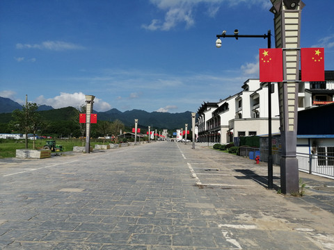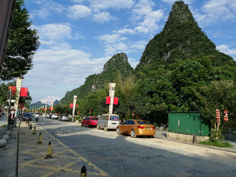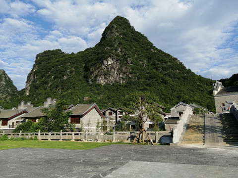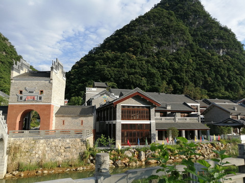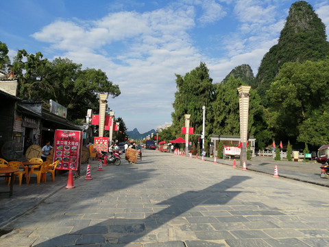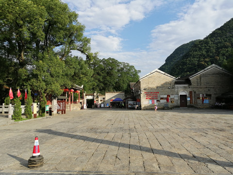 古镇商业街是由凹凸不平的青砖铺设而成的石板道,商业街被呈喀斯特地貌的大山深深怀抱着,在蓝天白云下显得格外清朗、明净。