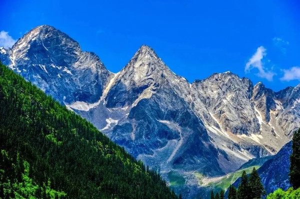 “品”字形的三座雪山似巨型金字塔状排开,威武雄壮。