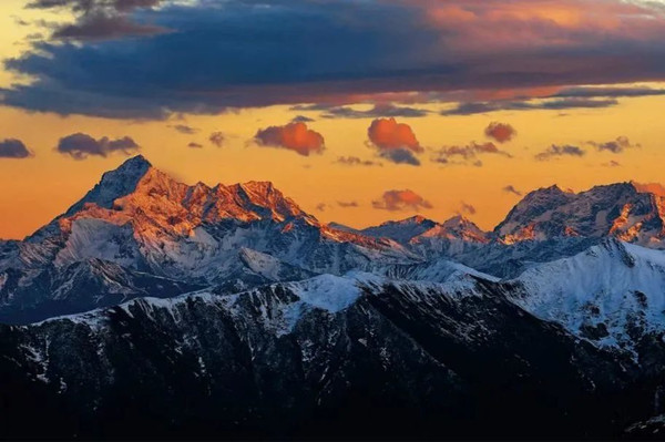 终年不化的积雪在日出的照耀下显得金光灿灿,“日照金山”的神奇景色跃然眼前。
