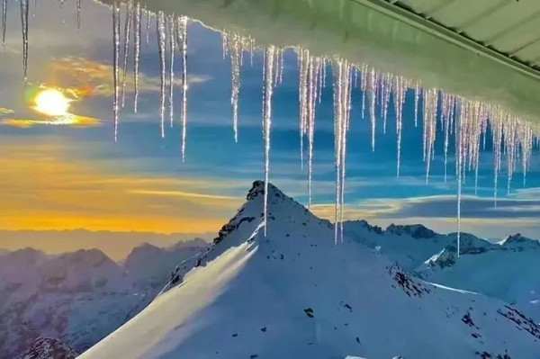 而换个角度,阳光开始妩媚深情,温柔地抚摸着洁白的山顶,美好又治愈。
