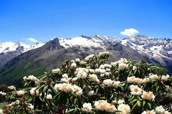 得益于特殊的冰川地质以及山顶终年的积雪,达古冰川的杜鹃花与山顶的雪域风情互相成就。一半花开一半冰雪,一半冬姿一半春色。