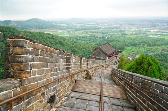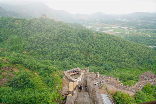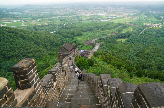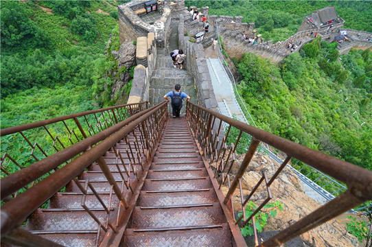 角山长城海拔519米,说起来不高,可是越往上攀爬,会有几段长城十分陡峭,有明显的随山就势特点。这里长城和其他的地方有着很大的不同,高度一般为7~10米 , 宽度平均4~5米。在山势陡峭之处,也有利用山崖砌筑的,可窄到2.7米宽,有的地方甚至没有台阶,爬的时候需要抓紧两边的栏杆。