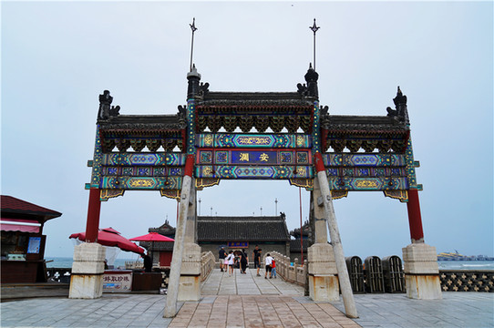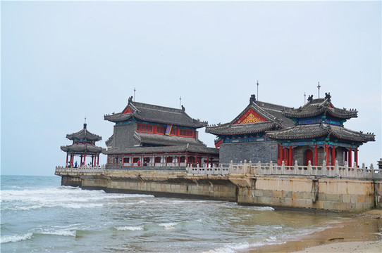 长城连海水连天,人上飞楼百尺巅,老龙头最著名的建筑就是澄海楼。澄海楼高14.5米,面宽15.68米,进深12米。楼分二层,楼上的楹联大有来头,一副楹联"日光用华从太始,天容海色本澄清"是当年清代乾隆皇帝御笔亲题,大家来的时候可以留意一下。
