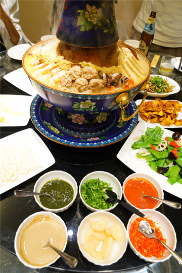 看着各种食材整齐码放在火锅之中,就觉得食欲大开,听当地人说,最著名的浑锅一定是景泰蓝的,各种好吃的食材分门别类地码在锅中,五花肉、鸡丝、八爪鱼、扇贝、牡蛎、肉丸、冻豆腐、焖子、对虾、虾米、排骨、鸡块,都是浑锅的食材,加上原味鸡汤,等火锅冒热气后,沾着佐料就可以开吃了,味道鲜香入味,是舌尖上最美的享受。