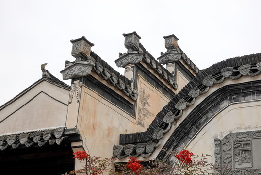 从外面看,清一色的白墙灰瓦的建筑坐落于山间,水与亭、台、楼、阁、塔、坊等建筑交相辉映;走进去,砖雕、石雕、木雕随处可见,雕刻精美,流檐翘角,给人以古朴、宁静、典雅之感。