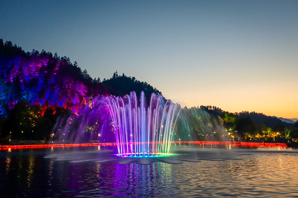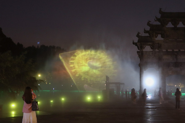 夜游西递从村口的明经湖开始,湖面上的喷泉随着动人的音符变幻出各种梦幻般的姿态,等待游客们汇聚到湖畔,除了喷泉,西递的大型水光影秀也是一道靓丽的风景线,神奇的高科技,用水幕能形成一幅幅动态画在空中徐徐展开,讲述了历史悠久的徽州故事。