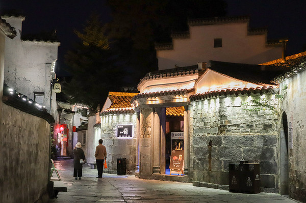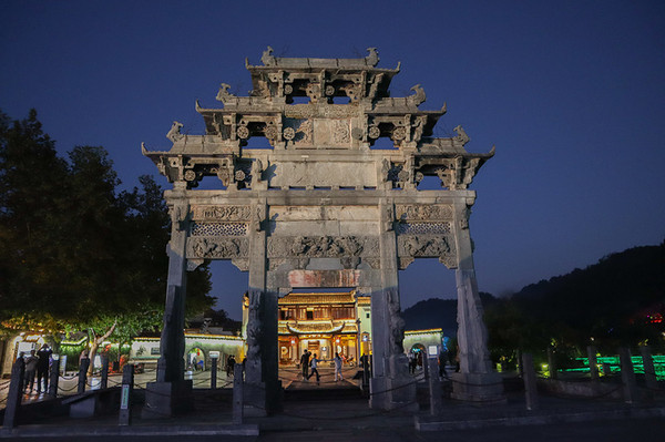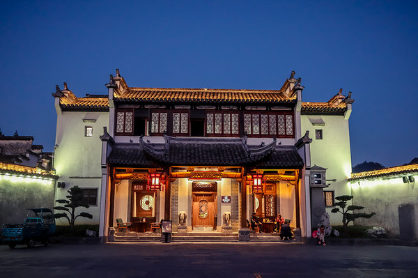 华灯初上,是西递最美的夜。我们回到了村口,走在明经湖旁,当天空将黑未黑之时,摄影人称它为魔鬼蓝,这个时候的天空是深蓝色的,最美的夜景就从这里开始。