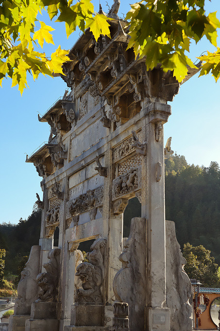 一进西递村,一座石牌坊赫然耸立。这是建于明万历六年(1578年),“胶州刺史”、“荆藩首相”胡文光的功德牌,牌坊四柱五檐,全是构造,饰以典型的徽派石雕,图案精美,寓意深刻。
