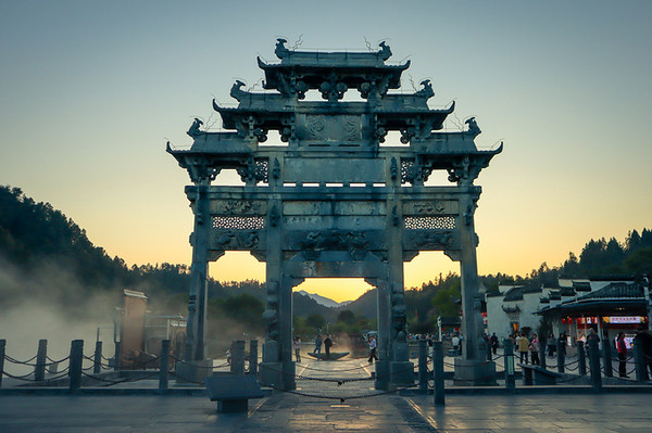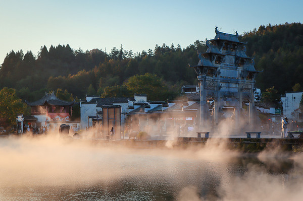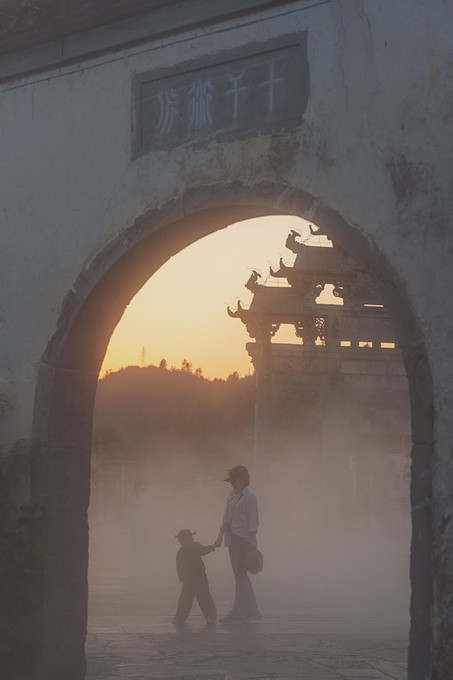 盈池碧水映古村,徽风皖韵尽遗存。夕阳正在西下,明经湖上放着雾气,恍如踏进了一片仙境,朦胧中,这斑驳陆离的粉墙,劫后余生的牌楼,空旷残败的祠堂,都凝聚成了一个可以触摸得到的符号。