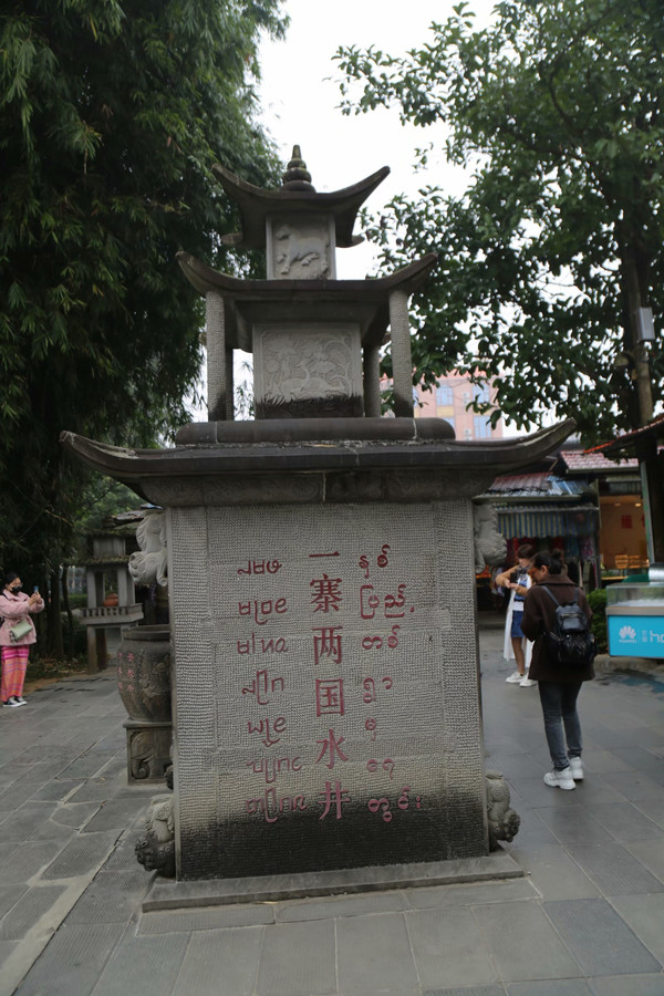 沿着中缅玉石国界线,跨过两国一桥,漫步于两国一寨,感受两国一井的景致,宁静而祥和。所有的游客,几乎毫无例外的都会来到71号界碑,用相机和手机记录这一时刻。靠近界碑的一荡两国秋千,许多人排队等候,坐上秋千,轻轻一荡,感受瞬间出国的便捷。在傣族民居里,我们还偶遇了居住和工作于我国的缅甸人,他们用汉语交流时,没有任何客居和不适的感觉。感谢佛国护经者,他们乘“凤鸟”远道而来,为边寨村民看护佛经,播撒中缅两国边境的和谐与安宁。