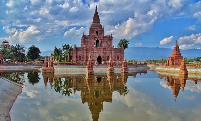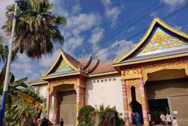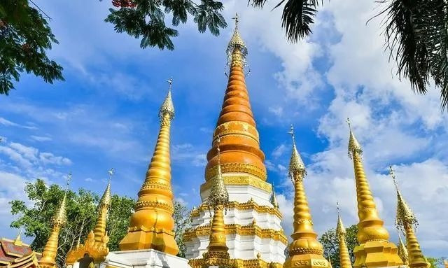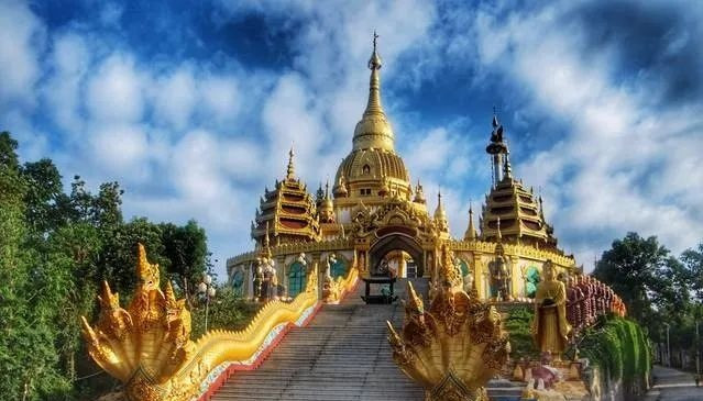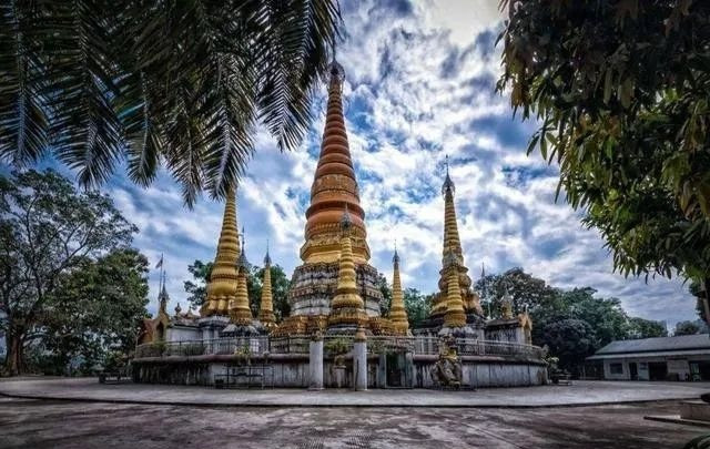 这座由17座塔组成的群塔,塔身贴满金色磁砖,除主塔外,四周环绕着16座小塔,塔身均涂金粉,充满浓郁的东南亚风情。