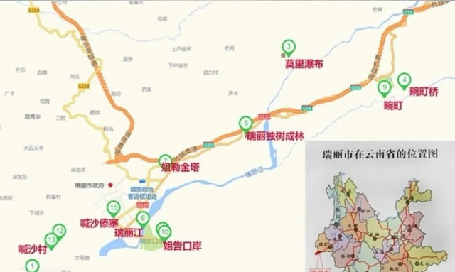 瑞丽不大,几个主要景点(上图标示)相距都不是太远,却个个风景如画、风情旖旎。