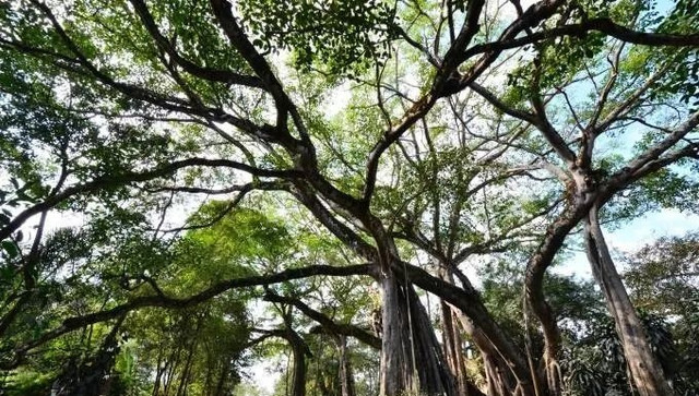 这棵树的树龄长达200多年,两侧的主枝上,有着32条大小不等,粗细不同的气根垂直而下,最后根部相连丛生,一树便成一林。