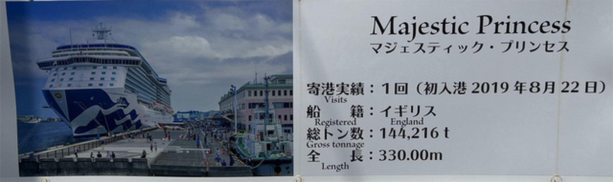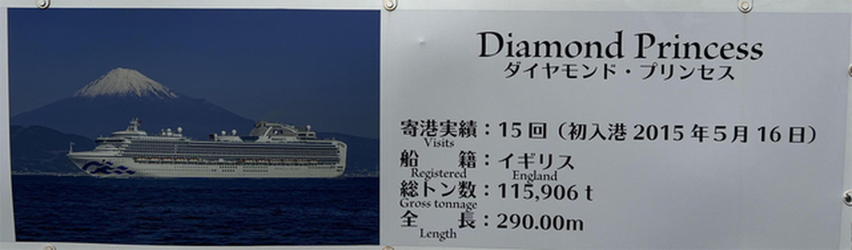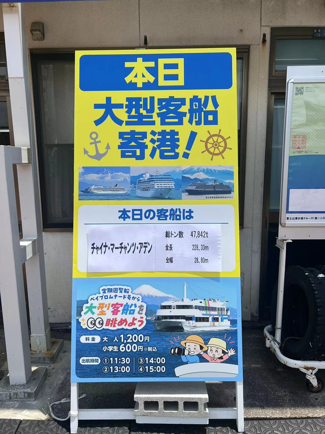 清水码头相当重视邮轮行业,还特别开辟出一个浏览路线:坐观光船远眺富士山,近观大型客船。招商伊敦48000吨都不到的体型,作为大型邮轮肯定是不合适的,但是作为大型客船还是绰绰有余的。码头附近还有各艘靠港邮轮的介绍,我在这里选三艘大家比较熟悉的: