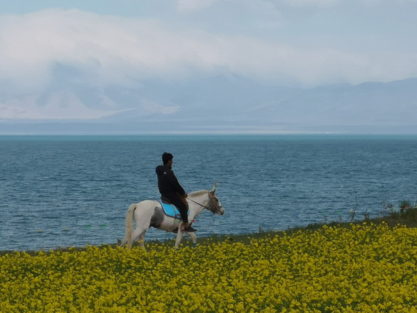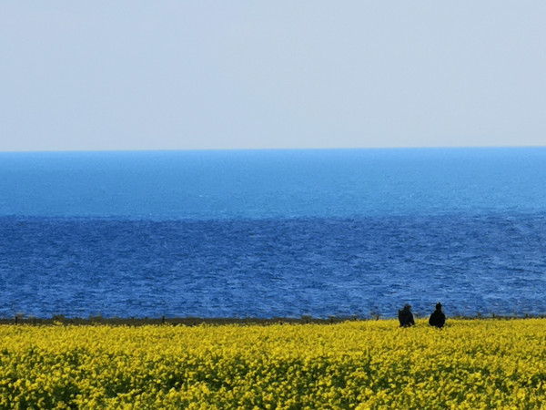由西向东过图标景区一二公里,有人种油菜花,一片金黄,衬映湖蓝,供人拍照。几个藏族看门人同时向我喊十块、二十块,我指向那个喊十块的说,我只听见他说的价格,其它的听不见,藏人粲齿一笑,让我把外面的车也叫进来,不另收费。