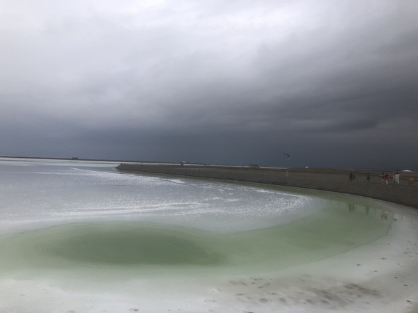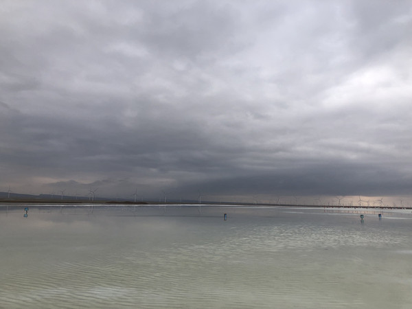 盐湖虽无倒影,却洁如碧玉,天空黑云翻墨,水下玉珠添光。