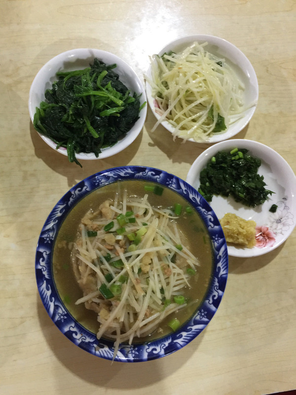 返回机场取上托运行李后在海东县城吃的当地特色餐:洋芋带菜与搅团津津(杂粮面实心巨形汤圆配小菜)
