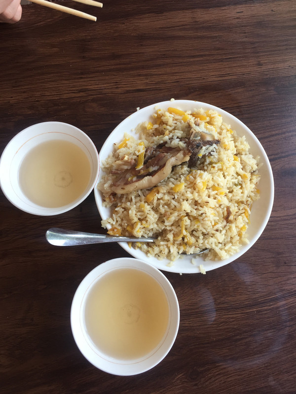十七点抵茶卡后,司机堂哥当地工作,带到当地菜馆,点菜排骨鸡,就是排骨与鸡肉乱炖,上蒸小花卷当主食。老板见堂哥身穿当地路政工服,低声说你们几个人吃一小份就可以了,138块。后见我北京口音,游客打扮,坐在主位,堂哥尾座,老板先闲扯几句,后对厨房大喊:排骨鸡一小份,188块。司机介绍当地菜馆常备阴阳菜单,对当地人与游客拿的是不同的菜单,刹那间十分怀念朴讷的维族人。后来见到上的肉菜一大锅,