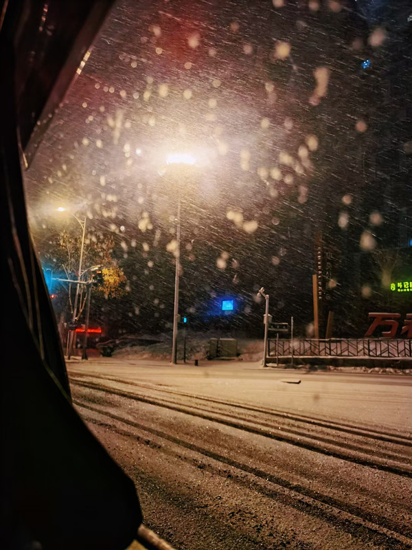 早上7点,外面的天是漆黑的。雪花在昏黄的路灯下散漫地飘着,有点浪漫。