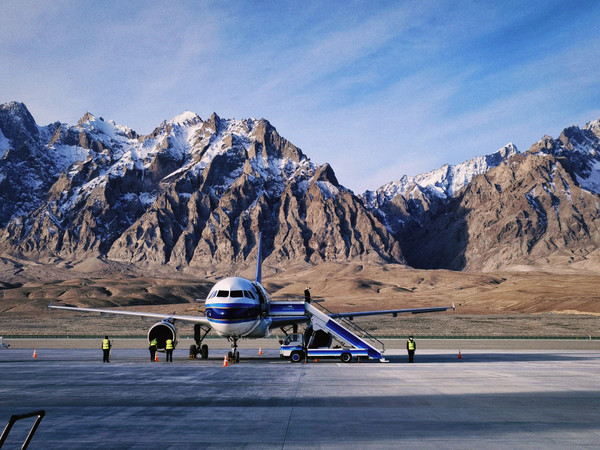 飞机平稳的降落在塔什库尔干红其拉甫机场,我们很荣幸的成为这座位于祖国最西端机场的首批旅客。今天,群山环绕的机场只停靠了我们这一架飞机,硕大的飞机在高山前都显得娇小了许多。