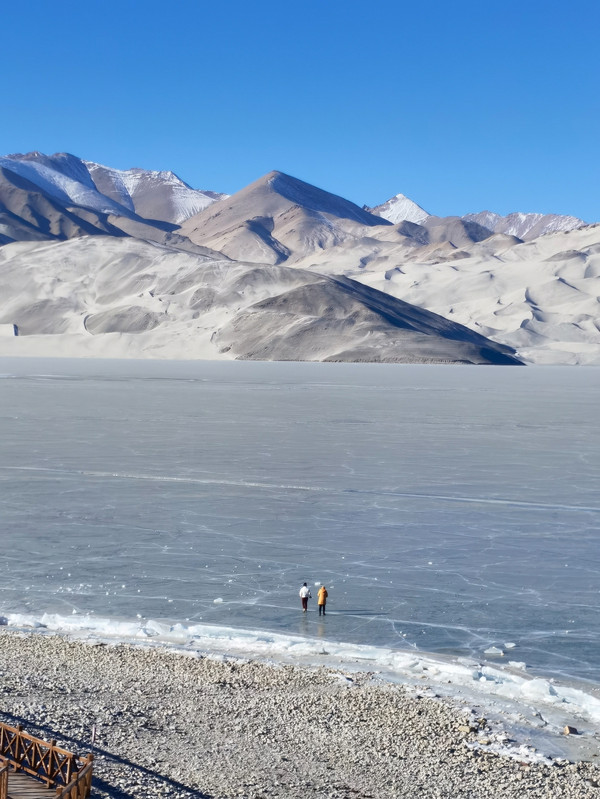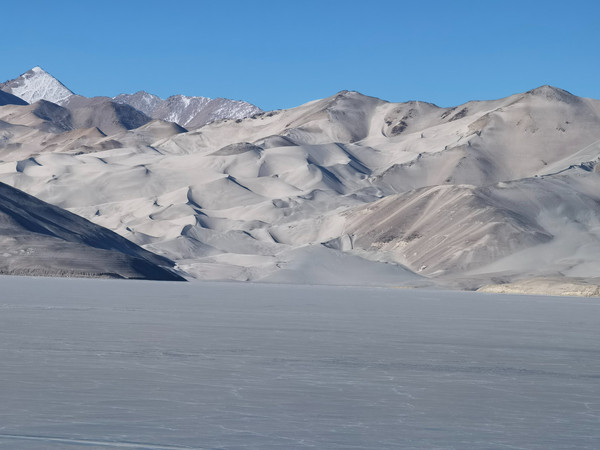 夏天,湖水会倒映出白色的沙山和远处的雪山;