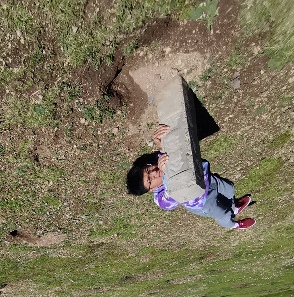 往林芝的路上翻越5013米的米拉山口,风雨交加,体感很冷,准备拍照,镜头里看到自己黑紫的嘴唇,放弃了自拍的念头,给儿子拍了几张到此一游标准照留做纪念。