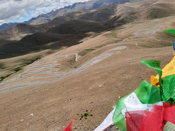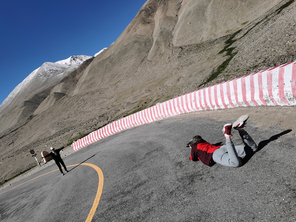 下午返回日喀则。途中遇到一个从重庆独自骑行去珠峰的皮肤黝黑、体型瘦小的小哥在用无人机拍108拐,