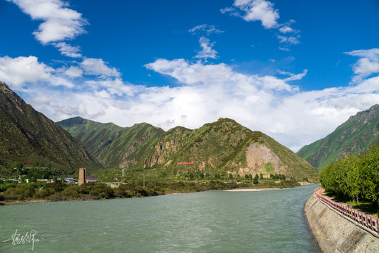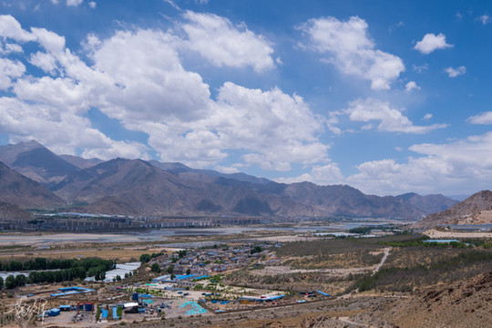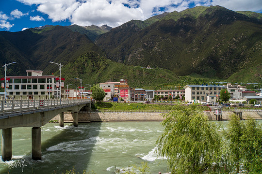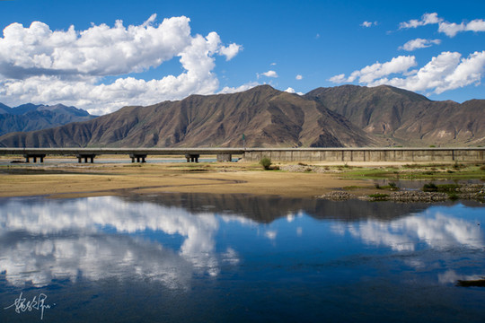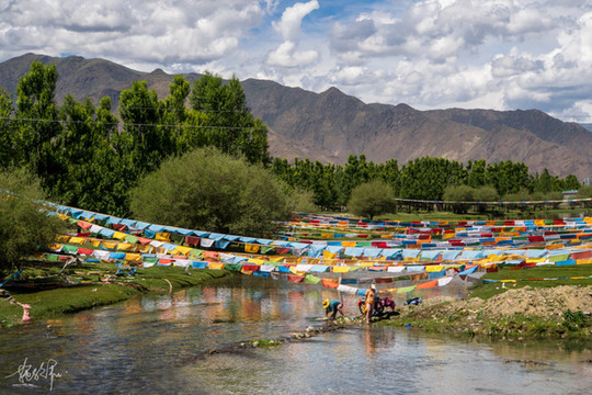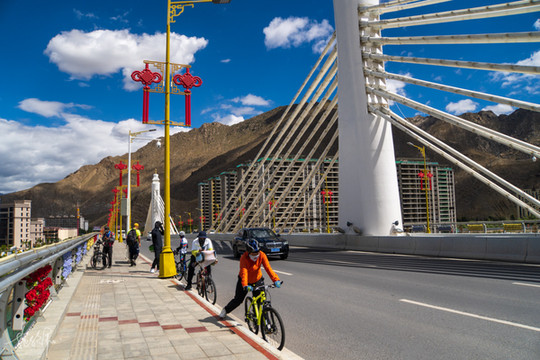 游玩过后我们继续往前骑行,很快便来到了老 达孜 大桥,这个悬挂着满满的经幡的大桥已经不准上去了,今天天气一路都非常好,蓝天白云倒映在河床上,风景十分秀丽。前往 墨竹工卡 的川藏公路,从 拉萨 出发一开始都是沿着 拉萨 河走的,有山有水,美不胜收。