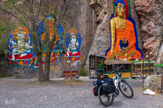 早晨泡了点麦片,九点左右出发,目的地是羊湖脚下的岗巴村,距离 拉萨 80公里,准备了一个礼拜时间去环羊湖。一口气到了聂当大佛才休息,看了一眼墙上的大佛正准备继续往前骑,遇到了两位骑友。