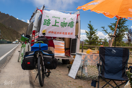 早晨出发的时候骑友李威还在喊着说要买杯咖啡,我是真的害怕重,特别是未来两三天我爬的第一座山就是海拔超过5000米的米拉山,最后还是怂了没有带上全套的咖啡器具,索性也放弃喝咖啡了。谁曾想,就在我们饥肠辘辘的时候,路边竟然出现了一个“路边咖啡”!